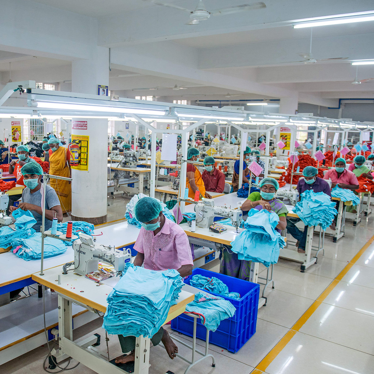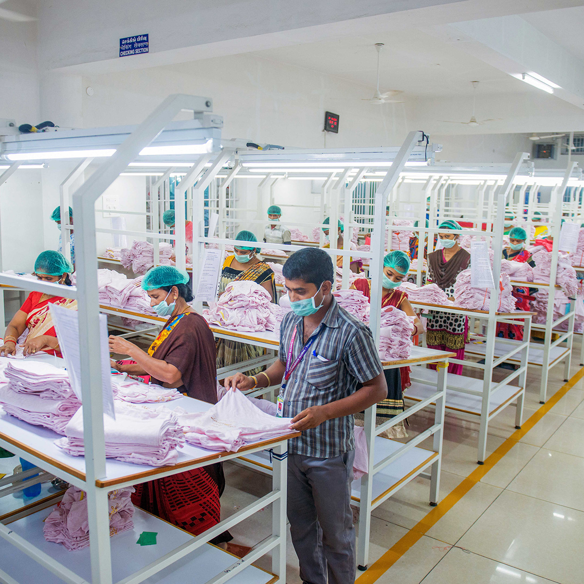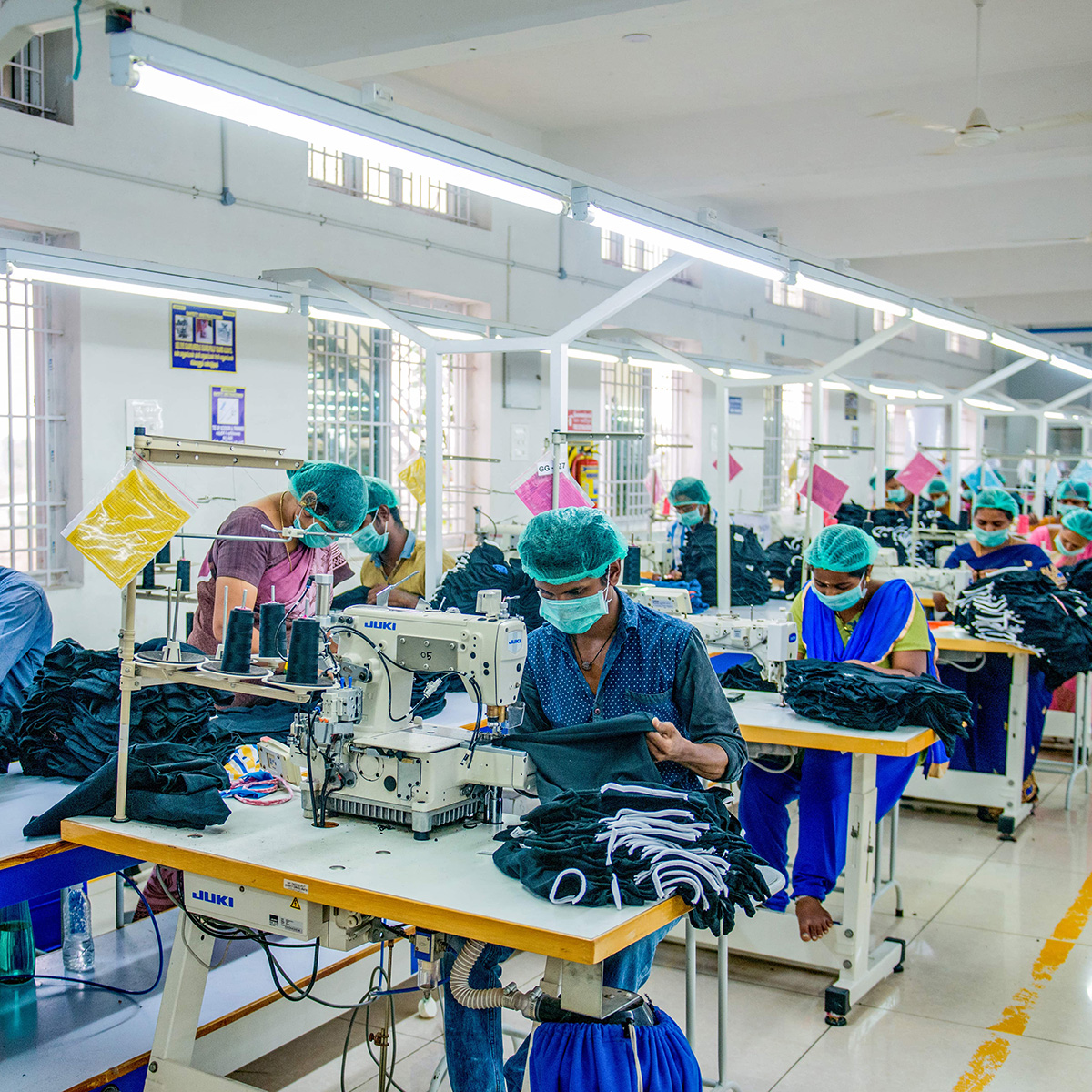 Our Production is spread across 30000 sq.ft. and has 100 Computerized lock stitch sewing machines.A centralized cutting unit ensures speed & consistent quality and includes auto fabric spreading table and band knife cutting. The capacity of production per day is at 6000 units per day.